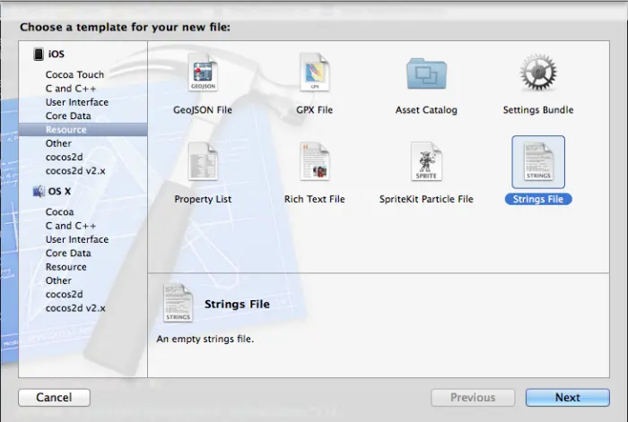 注意:Localizable.strings是iOS用来本地化文本默认的文件名称。请抑制以其他内容给它命名的冲动,否则以后你每次引用本地化字符串的时候要一次次输入.strings 文件名。 |