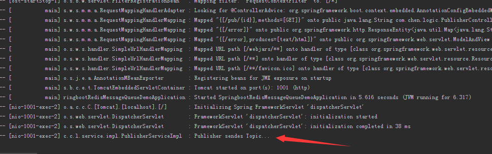 public String pubMsg(String id) {if ("1".equals(id)){ stringRedisTemplate.convertAndSend("phone","18888888888"); log.info("Publisher sendes Topic... "); return "success"; }else { return "no my phone"; }}