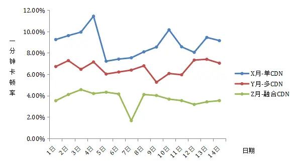 如图8所示,我们选择了X、Y、Z三个月的前半个月(两周)卡顿率数据进行了比较。其中X月运行了单CDN分发网络;Y月运行了多CDN分发网络;Z月运行了融合CDN分发网络。每天给出一个综合卡顿率数据。各月,云平台环境情况为:网络实际流量分别为日均5TB、12TB和20TB, 98%以上流量运行于国内, 流量无重大区域变化性差异。从图中,可以看出卡顿率有了明显下降,在融合CDN分发网络中,达到了我们预定<5%的指标要求。