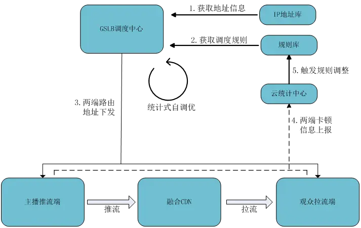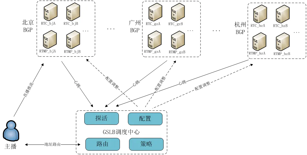 我们在全国二十几个主要区域部署了源站集群,在重要区域,例如北京、上海、广州、杭州等,采用BGP网络。其他区域采用多线。从而保证用户与源站之间网络的高质量。我们通过全局调度中心GSLB进行源站调度。调度中心,通过心跳式探活,感知实时情况。通过配置模块,动态调整源站的配置,如流量限制,黑白名单限制等。主播在推流之前,从调度中心获取源站路由。调度中心会根据推流源地址、策略表,最优选择一个源站。整体框架如图6所示。