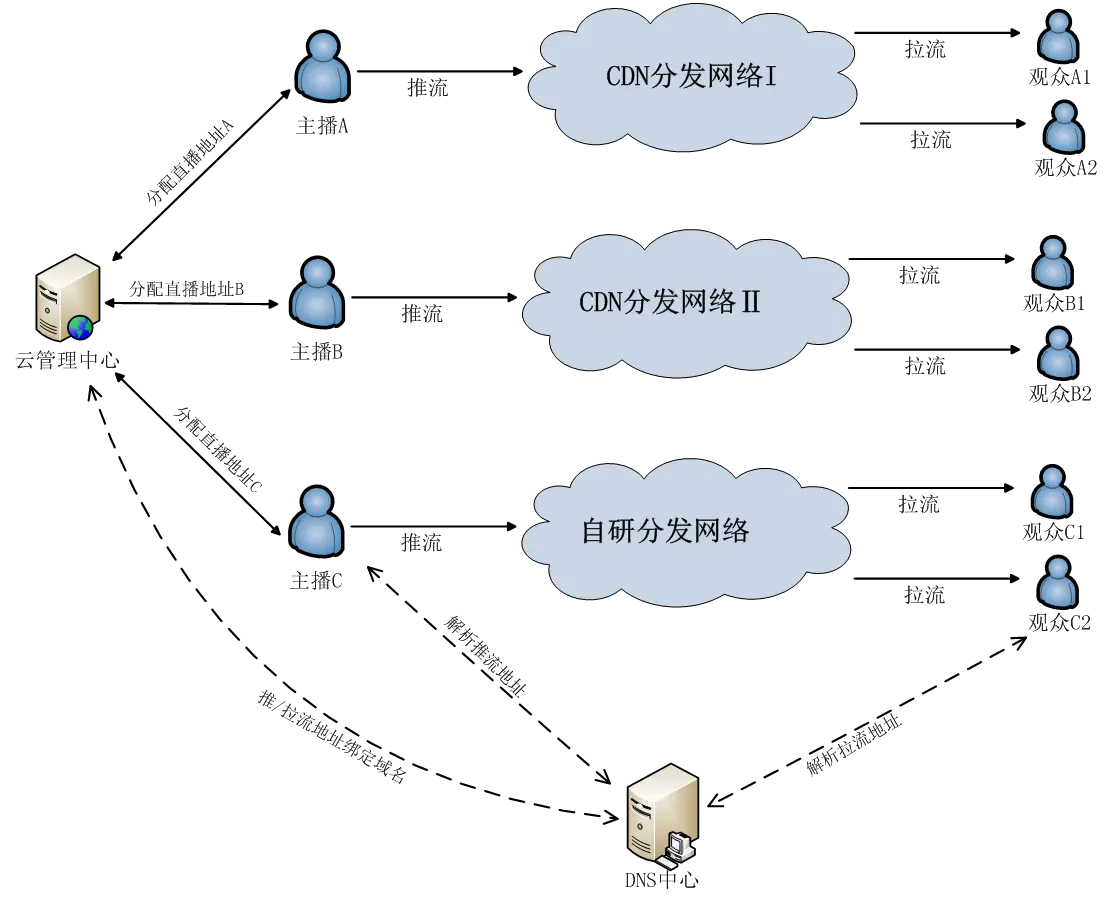举例说明,主播A为北京移动线路,我们就选择上行较优的CDNⅡ进行分发;主播B为上海电信线路,选择电信较优的CDNⅠ进行分发。选择策略在云管理中心进行配置。选择策略根据,基调测试结果或线上结果反馈,定期调整。