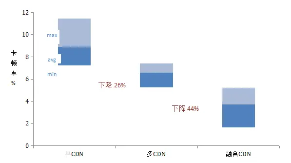 如图9所示,给出了单CDN、多CDN和融合CDN的平均卡顿率下降指标。使用多CDN分发网络比用单CDN分发网络两周平均卡顿率下降26%。 使用融合CDN分发网络比用多CDN分发网络两周平均卡顿率下降44%。