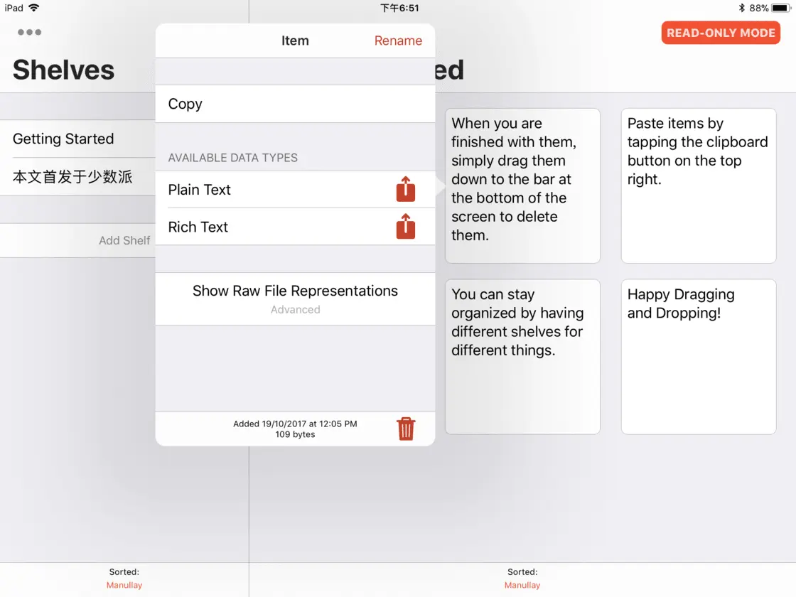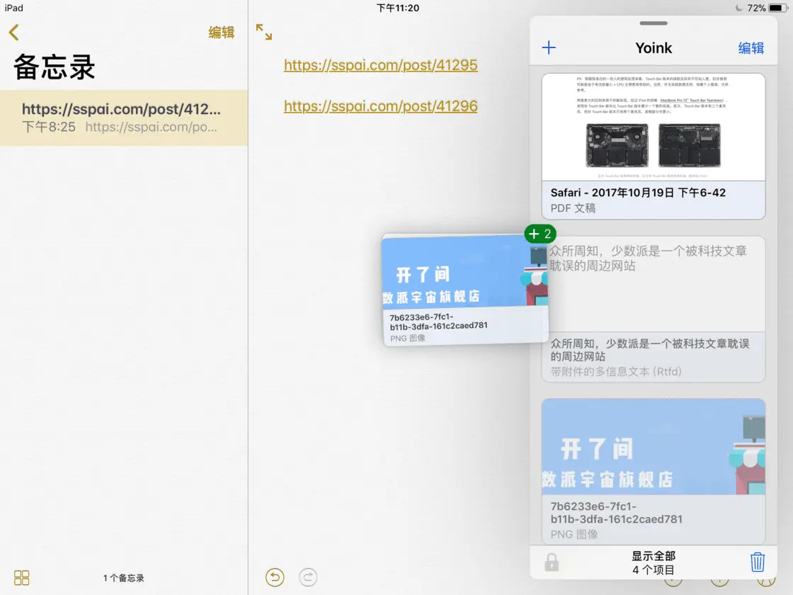 我在写剪贴板工具测评的时候,「囤积」了大量素材,久之发酵出了一个想法:剪贴板已经支持了多种文件格式,能不能把它们打造为零碎内容的管理中心?于是,我开始有目的地用 Copied 代替原生备忘录,发现在 iPad 上,拖动收集、调用内容比使用笔记应用要方便得多。