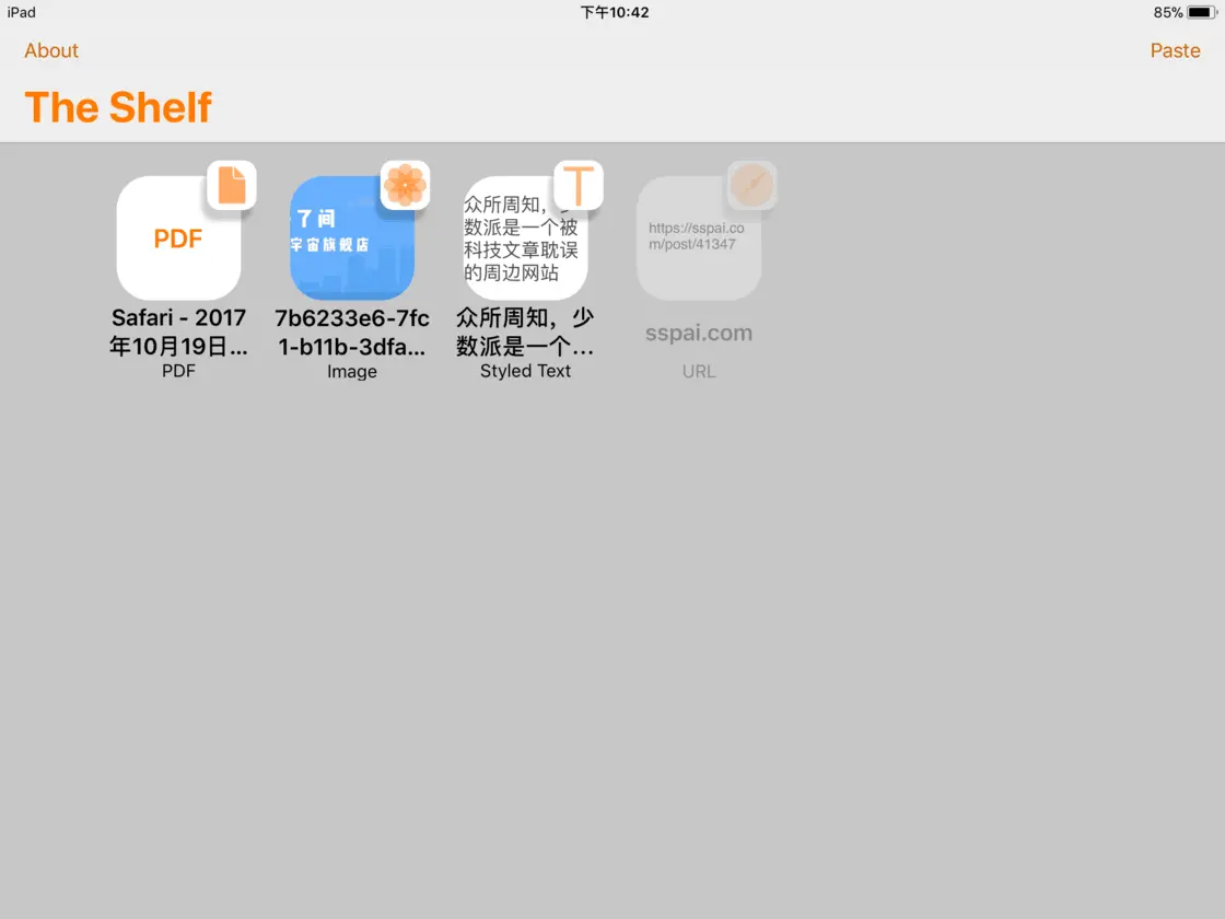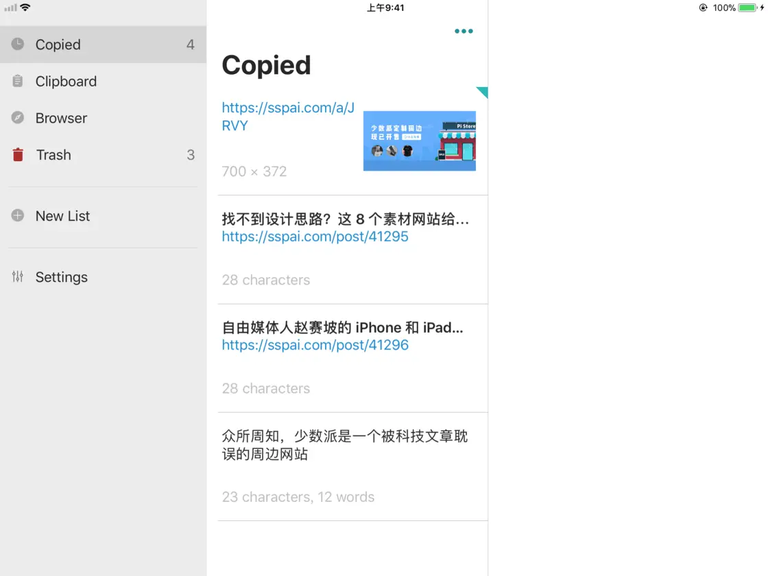 如果你是一个剪贴板重度用户,也许不需要单独的 Shelf App。但是 Copied 的一大问题就是支持格式有限,那么 iPaste 是另一个选择不错的选择。分组和 Pin 可以把常用内容拎出来,同步也是亮点,可以和 macOS 版的 iPaste 协同工作。
