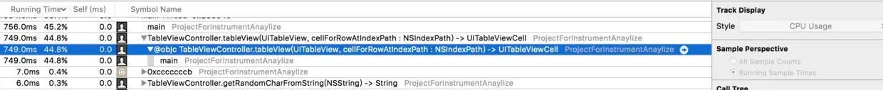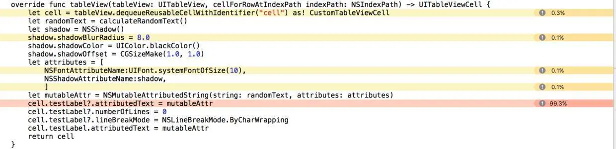 因为,每一次CellForRow调用的时候,都会计算100次。然后,我们实际分析的时候,发现其实100次对显示来说,真不算什么,也不是卡顿的原因。