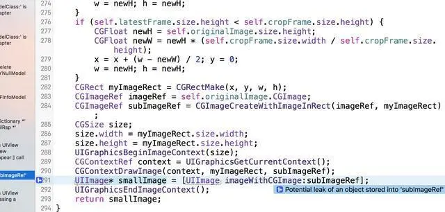 (3)调用了让某个对象引用计数加1的函数,但没有调用相应让其引用计数减1的函数。Xcode提示信息: Potential leak of an object stored into 'subImageRef' 。 翻译一下:subImageRef对象的内存单元有潜在的泄露风险。