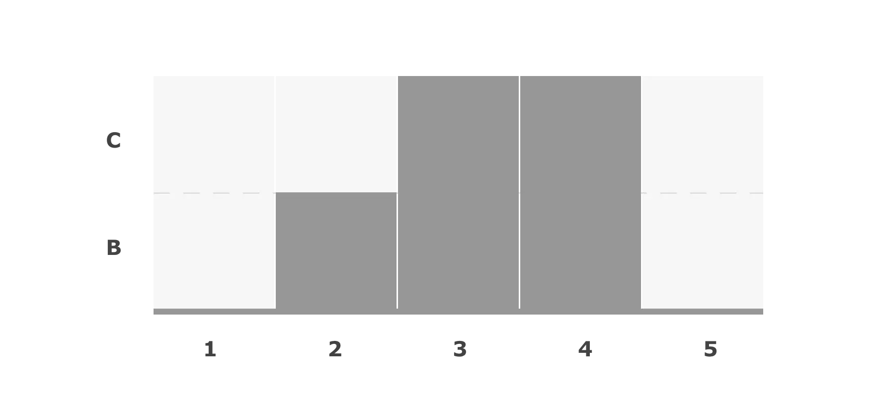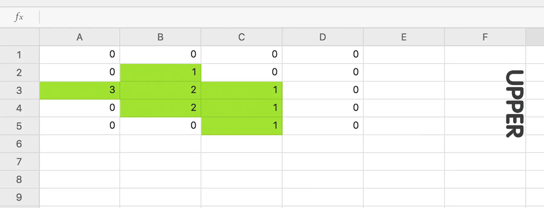 以 A1-D5 为矩阵边界,我们从 D 列开始开始对每一列计算直方图的最大矩阵,其中图中的“upper”为直方图的上部方向。对于每一列,我们使用一个长度为 N (如果使用 Sentinel 来避免边界计算的话则为 N+1)的 cache 数组来存储当前列的直方图高度,即其右侧连续公共属性矩阵的长度。拿 B 列举例,其对应的直方图为:
