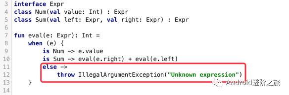 之前在介绍when表达式的时候,我们用了一个表达式的例子,Num和Sum继承于基类Expr,分别表达数字和两个表达式之和,而对于不属于Expr的子类,我们需要提供额外的else操作符。
