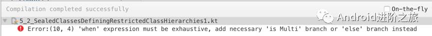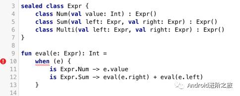 这时候,我们在when表达式中已经处理了所有Expr的子类,就不再需要提供默认的分支,假如这时候我们给Expr添加一个新的子类Multi,但是不修改when中的逻辑,那么就会导致编译失败: