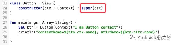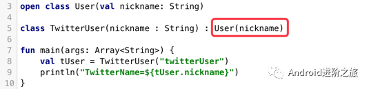 而在Kotlin中,可以通过在基类列表的父类引用中提供父类构造方法参数的方式来做到这一点: