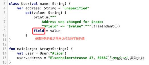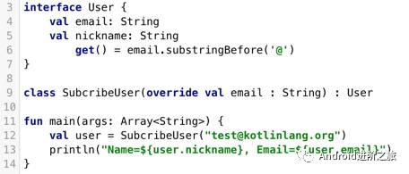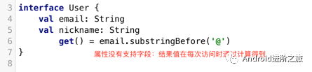 SubscribingUser:通过一个自定义的getter实现,这个属性没有一个支持字段来存储它的值,它只有一个getter在每次调用时从email中得到昵称。