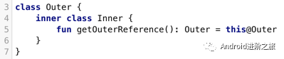 如果要把它嵌套类变成一个 内部类 来持有一个外部类的引用的话需要使用inner修饰符,并且访问外部类时,需要使用this@{外部类名}的方式。