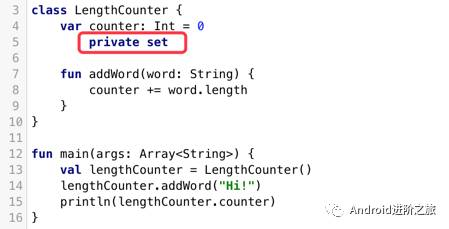 访问器的可见性默认与属性的可见性相同,但是如果需要可以通过在get和set关键字前放置可见性修饰符的方式来修改它,例如在下面的例子中,我们将setter的可见性修改为private: