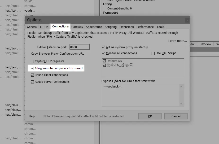 这是为了能够捕获远程设备(在这里也就是我们Android手机)上的请求而勾选的。(IOS手机的抓包应该也是同理的,只是我没有测试)