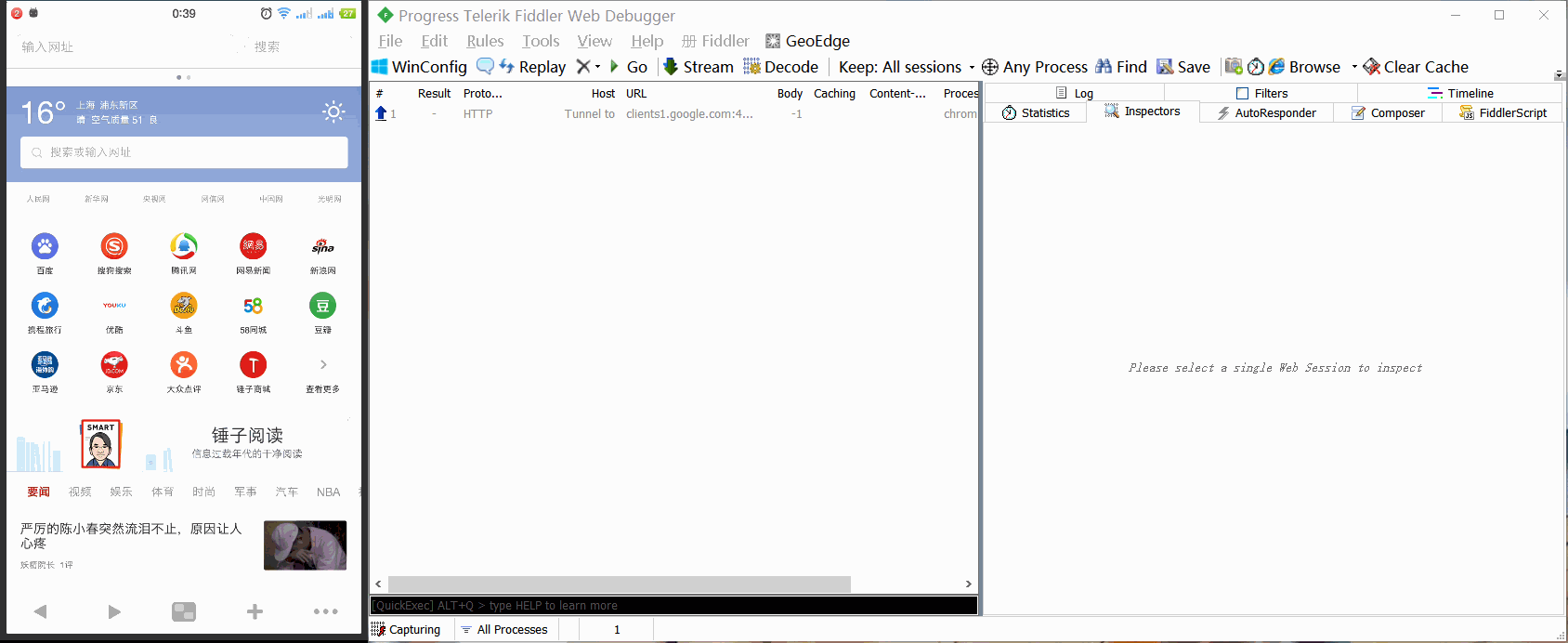 左边是我的手机在电脑上的投影。右边是fiddler软件
