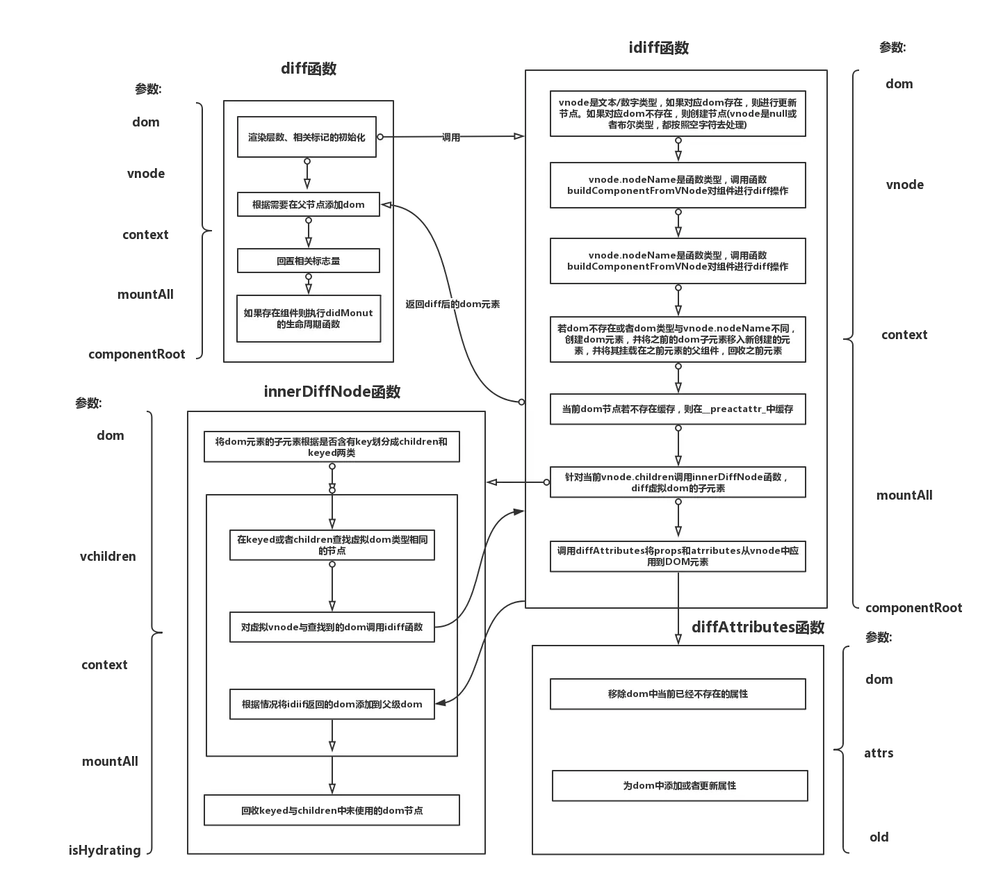 dom: 组件对应的真实dom节点vnode: 组件的虚拟dom节点context: 组件的中的context属性mountAll: 表示组件的内容需要重新渲染而不是基于上一次渲染内容进行修改。
