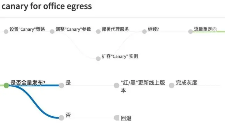 如图 18 所示是线上真实的部署流程。首先是要设置一个 Canary 策略,这个策略可以指定完全随机还是根据用户的特定来源。比如说是一个办公室用户,或者所有上海的用户等等,然后去调整参数,是 1% 的上海用户,还是所有的上海用户。然后开始部署服务。接下来把这个 Canary 实例做扩展,在流量进来之前,实例的容量一定要先准备好。进来之后把流量做重新定向,把流量从原来直接打给后端的 Pod 改成打到 Canary 代理服务上,由 Canary 代理服务根据策略和用户来源做进一步的流量分发。整个过程不断的迭代,有 1% 的线上用户开始慢慢到到 100%。在达到 100% 后,就采用红黑的策略替换掉所有旧版本:先把所有的新版本实例生成出来,等所有的新版本通过健康检查,都在线了,旧的版本再批量下线,这样完成一个灰度。如果中途发现问题不能继续,马上就可以回退,所谓的回退就是把 把流量打回到线上版本去。