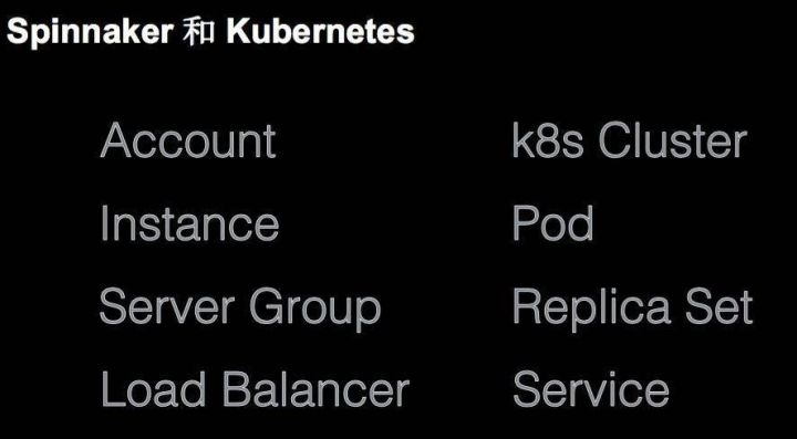 Spinnaker 和 Kubernetes 有什么关系?它有很多概念是一对一的,Spinnaker 有一个叫 Account的,Account 对应到 Kubernetes 是 Kubernetes Cluster,我们的环境里现在有三个 Kubernetes 的 Cluster,分别对应到开发、测试和生产,它也是对应到 Spinnaker 的 三个 Account;Instance 对应到 Kubernetes 里是 Pod,一个 Pod 就是一个运行的单元;还有有 Server Group,这个 Server Group 对应的是 Replica Set 或者是 Deepionment。然后是 Load Balance,在 Spinnaker 里称之为 Load Balance 的东西在 Kubernetes 里就是 Service。