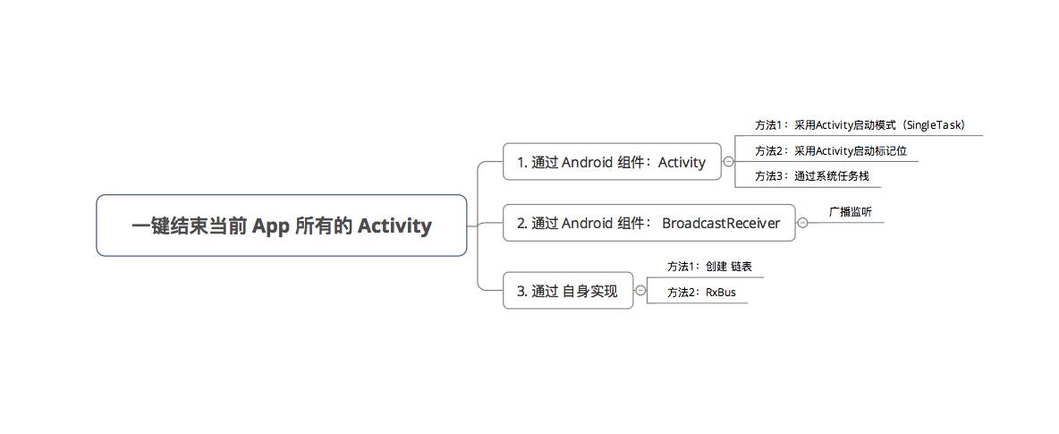 RxBus当作事件总线,在每个Activity里注册RxBus订阅(响应动作 = 关闭自身);当需要退出App时 发送退出事件请求即可。 -