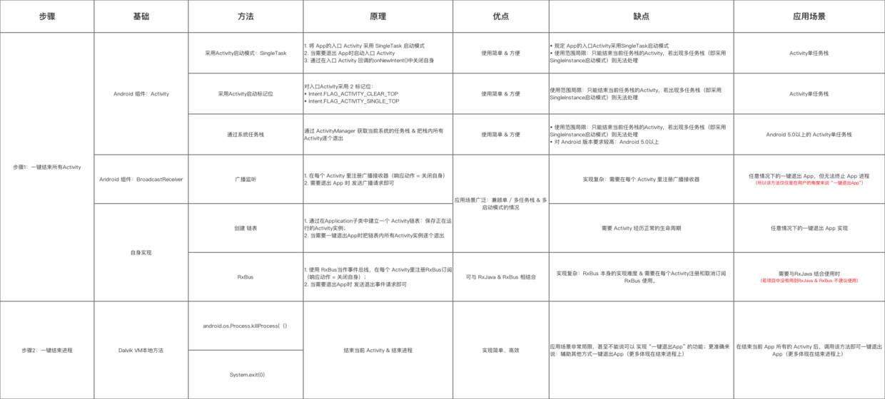 Activity(即退出了其余Activity后),调用即可退出该进程,即在(步骤1)结束当前 App 所有的 Activity 后,调用该方法即可一键退出App(更多体现在结束进程上)