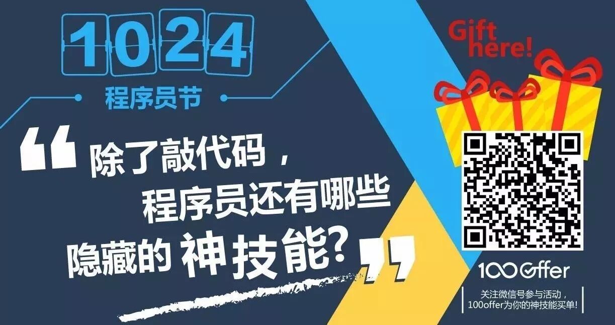 1024程序员节这天,100offer给你一个撕掉标签的机会:关注100offer 微信号,发送一段话/一张图/一段视频/一条语音…展示你除了敲代码以外的神技能,还有最高价值1024元的“程序员兴趣基金”等你拿!