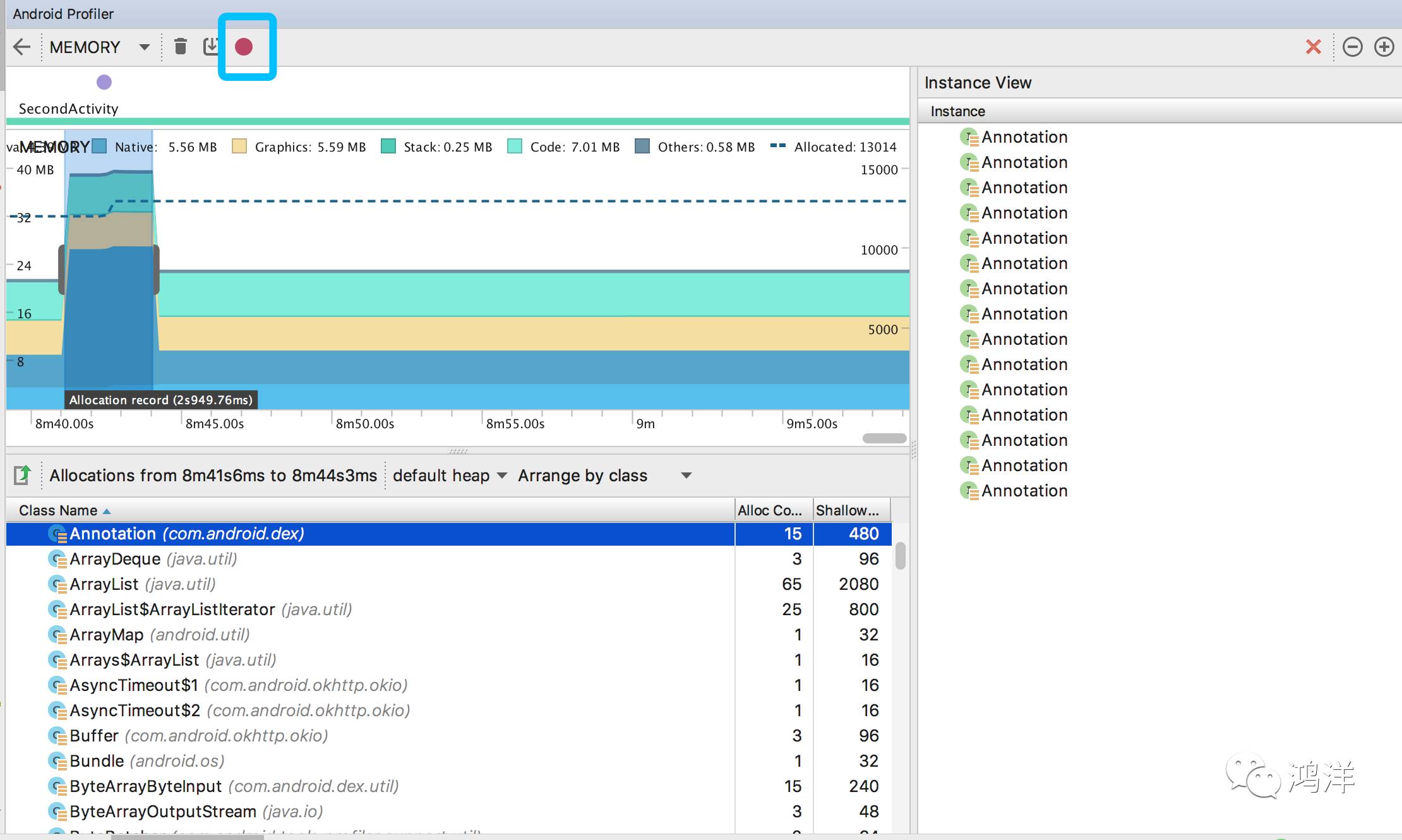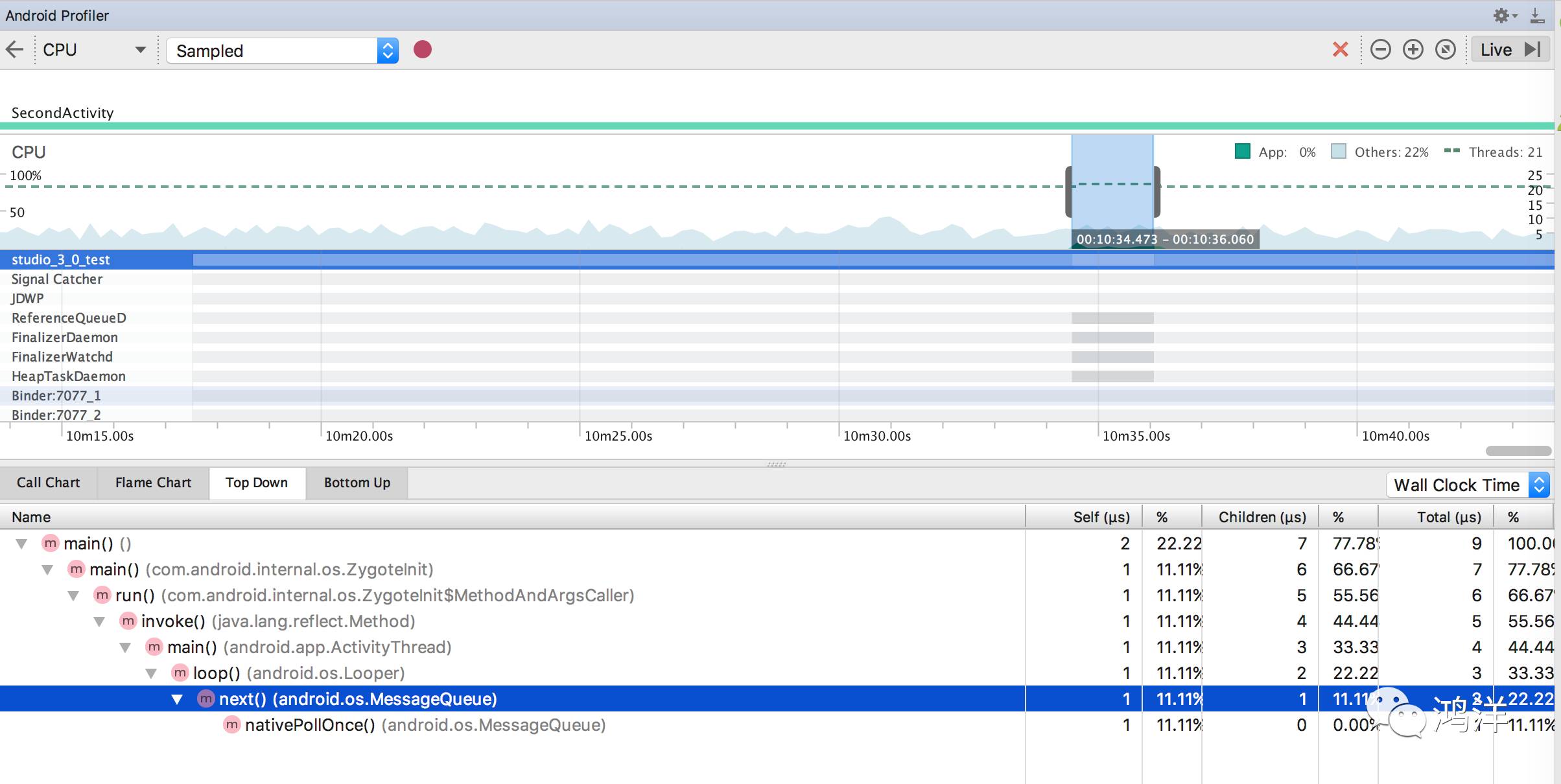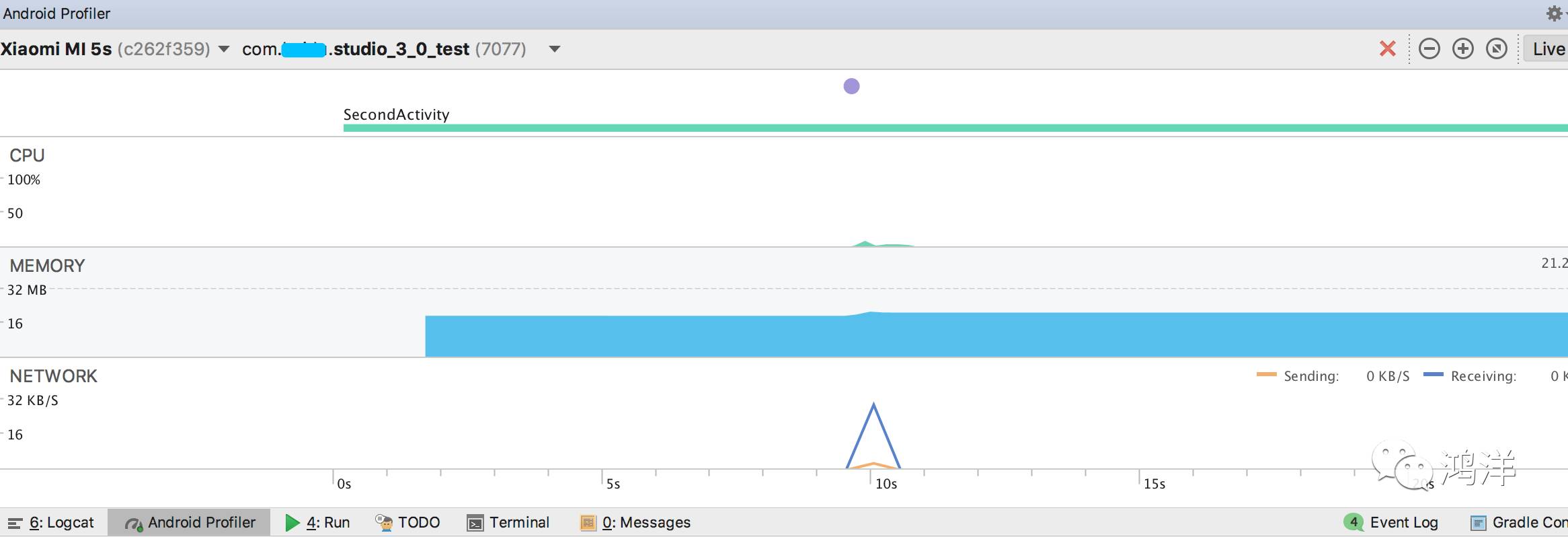 最上面会记录每个Activity的打开,以及你的一些操作(上面的小圆点,点击按钮等)。