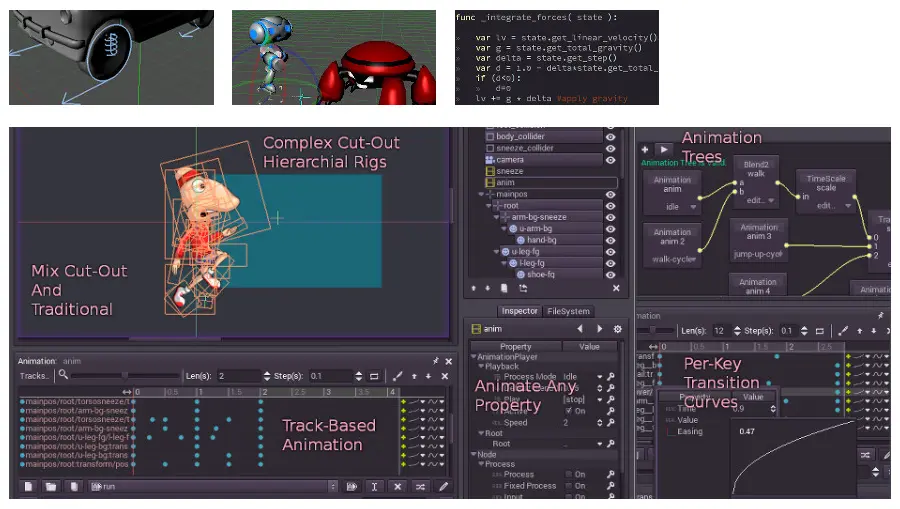 Godot 引擎内置了类似Unity的编辑器,GUI 工具包,2D/3D 物理支持,支持 OpenGL ES 2.0 功能集的 3D渲染器,易于学习的语言和 API,支持用 ASM.js 或 Google Native Client 输出 HTML5 代码,支持 Linux、Windows 和 OSX 开发平台。