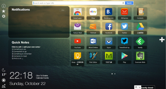 homenewtab 扩展默认设置会在页面显示多个功能模块,提供了提醒通知、快速备忘记录、天气时间、本地已安装的 Google Apps、搜索栏,homenewtab 还支持自行添加 New App、快速显示最近关闭的网页、更换壁纸,初上手会有点略微臃肿的感觉。不过经过使用之后发现了 homenewtab 三大特色功能: