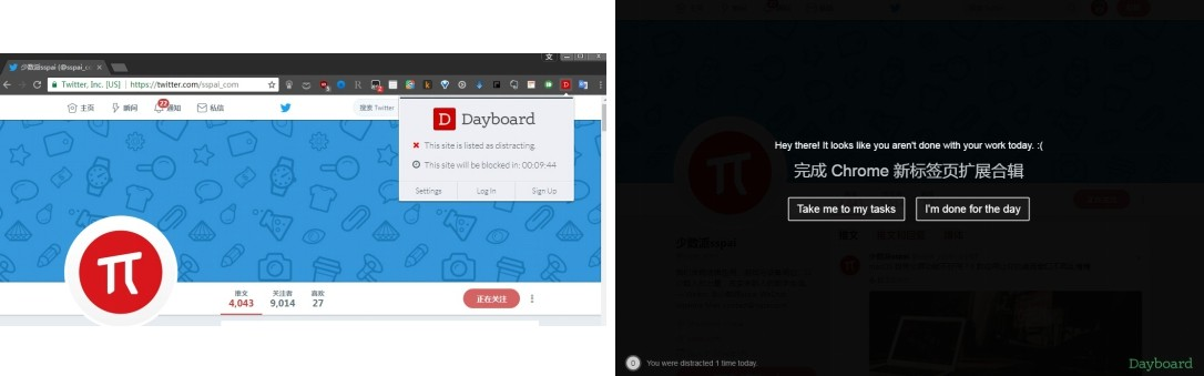 其中有意思的就是 Blocked Sites 禁止访问功能,用户可以自行添加禁止网站列表,如果 Dayboard 中有未完成的任务清单,禁止网站每天仅有默认 10 分钟的浏览时间,直至任务完成。