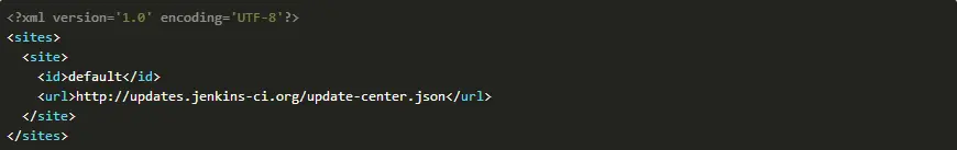 可以发现JENKINS_HOME下有两种命名的规则,一种是标准的命名,例如config.xml或者nodes的文件夹;还有一种类似类名的文件名,例如hudson.model.UpdateCenter.xml这种的文件。这两种文件的命名可以推测出一种是Jenkins内部实现的一些存储,而另一种是Jenkins提供出来的通用文件存储机制。那么我们打开一个文件来看下存储的内容是什么样子的,比如hudson.model.UpdateCenter.xml,里面的内容如下
