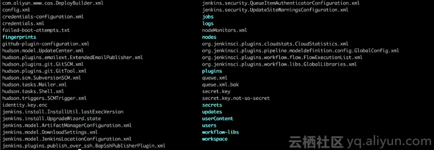 通用格式的存储例如com.aliyun.www.cos.DeployBuilder.xml则大部分是插件的存储文件,开发过Jenkins插件的开发者可能知道,在Jenkins的插件中并没有读取配置文件的动作,只有一个save方法,开发者需要进行配置存储的时候,只需要调用父类中继承下来的save方法即可。而这个save的方法的实现会自动以上面的这种类名为文件名的方式存储在JENKINS_HOME目录下,因此,这也就是为什么不建议大家直接存储配置的秘钥到自己的插件中,而是需要调用credentials插件来实现,因为Jenkins在默认存储的时候不会直接对你的秘钥信息进行加密,会有很高的安全风险。那么Jenkins在何时会反序列化数据的呢?答案是Jenkins启动时。Jenkins在启动的时候,首先会启动主进程server,然后加载所有的插件,再加载数据。在加载插件的时候,会通过类名查找相应的配置文件,再将配置中的信息反序列化Java的对象,因此如果在Jenkins的插件中存储了大量的数据,会造成Jenkins重启加载异常缓慢的问题,如果在插件中有大量的存储需求,建议大家将存储代理给Jenkins的Job,虽然Job在加载的时候也是在Jenkins启动时通过文件的方式加载的,但是每个Job的配置是隔离的,不会造成单次大文件的读取效率瓶颈。