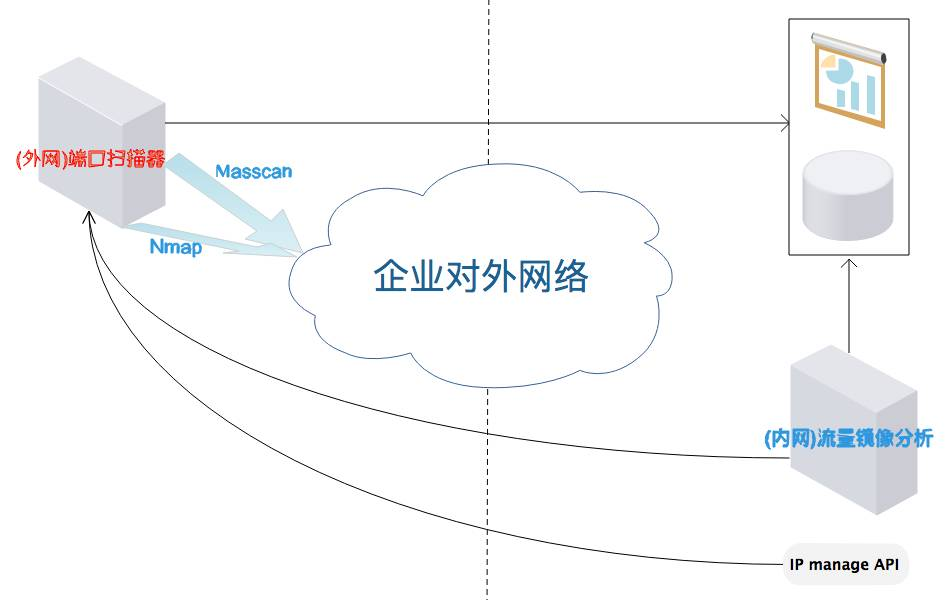 对企业的外网开放端口进行监控不外乎两种方法,一种是类似于黑盒审计的外网端口扫描,另一种是类似于白盒审计的流量分析。从原理上来说流量分析的方式肯定是最准确的,但这对软硬件都有一定要求,一般的公司不一定有能力做好;外网端口扫描的方式比较直接,虽然也有一些环境上的依赖,比如网络带宽,但总体上来说要比流量分析的要求小得多,大部分公司都能满足。这里我们主要介绍一下外网端口扫描的方法,另一种流量分析的方法,以后请具体负责同学给大家分享。