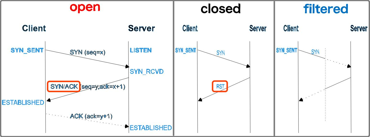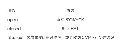 我们这里使用的TCP SYN扫描就是通过先主动发送一个SYN报文给指定端口(之后并不回复任何报文,不完成TCP连接),然后根据端口的返回信息做出判断,判断结论分为以下3种: