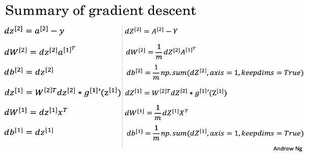- trick:Wi第一维是第i+1层的神经元个数,第二维是第i层的神经元个数;bi第一维是第i层的神经元个数,第二维永远是1,因为python有broadcast机制,自动对齐。