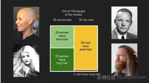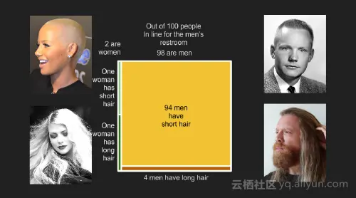 想象下在电影院中有一个影迷丢失了电影票,上图是他们从后面看到的样子,你想获得他们的注意,只知道他们有长头发,但无法区分他们的性别,你会喊出“对不起,夫人”或者“对不起,先生”吗?考虑到你知道你所在区域男女的发型,你可能假设这是一个女人。(这种简化中,只有头发长度和性别两个特征)。