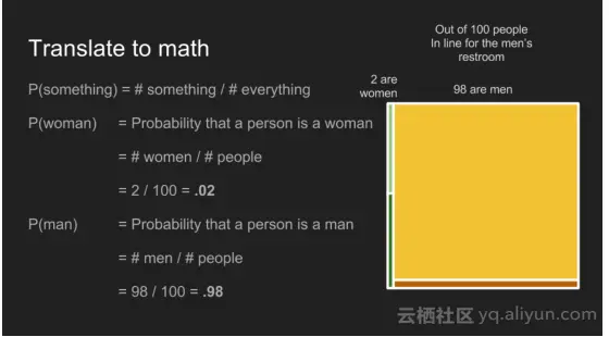 现在考虑这个人在男卫生间排队后情形的变化,有了这个额外的部分信息,你可能会认为这是一个男性。这种使用常识和背景知识是不需要思考就能得到的。贝叶斯推理是在数学上捕获这些常识与背景知识,以致于使得我们可以做出更准确的预测。