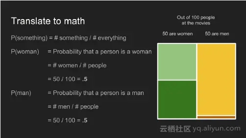 一个事件发生的概率可以通过能发生的数量除以可能发生的总数。一个影迷是女性的概率是50名女性/100观众 即0.5或50%的概率。这同样适用于男性。