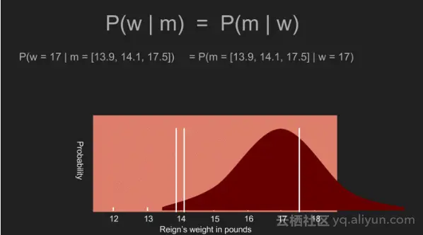 在这种情况下,假定狗的重量可能是13磅、15磅、1磅或百万磅,让数据说话,假设之前先验是统一的,也就是说其概率分布的所有值是常数。这使得贝叶斯定理简化为P(w|m)= P(m |w)。