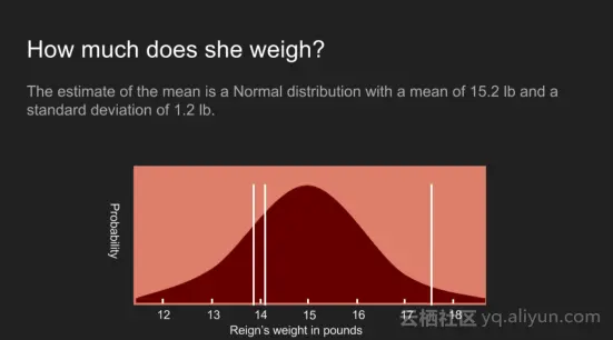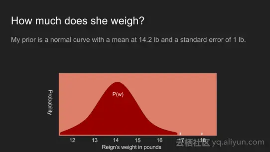 关于狗这种案例,我确实有更多的信息,狗的最后一次体重是14.2磅,虽然胳膊不是一个非常敏感的天平,但是给我的感觉并不觉得明显重或者轻了,因此相信狗的重量约为14.2磅左右,基于这一点,假设为峰值为14.2磅位置,标准偏差为0.5磅的正态分布来表示。