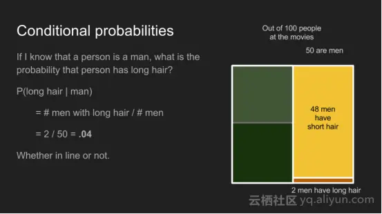 条件概率回答这个问题:“如果我知道,一个人是名女性,她有长头发的概率是多少?”条件概率的计算方法与概率一样,但他们只是看的所有例子中的一个子集——那些符合一定的条件。在这种情况下,P(长发|女性),假设她是个女性,其有长头发的概率是多少,等于女性有长头发的数量除以女性的总数。这会变为0.5,不管我们是否考虑到男卫生间排队或是在整个剧院。