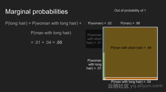 边缘概率为了回答问题“某人有长头发的概率是多少?”,为了解决这个问题,我们必须把所有不同的方式的概率加起来,长头发男性加上长头发的女性概率。加起来两个联合概率后概率P(长发)为0.27,但在男卫生间排队情况下为0.05。