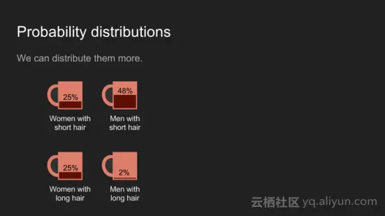 或者,我们可以采用四个杯子来代表性别和头发的长度的所有组合的分布。在这两种情况下,咖啡总量加到一个杯子里。