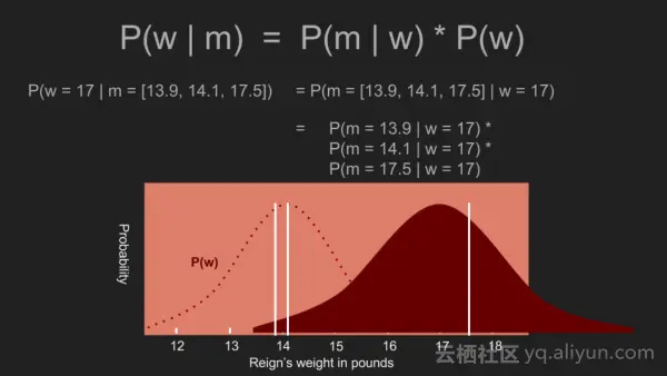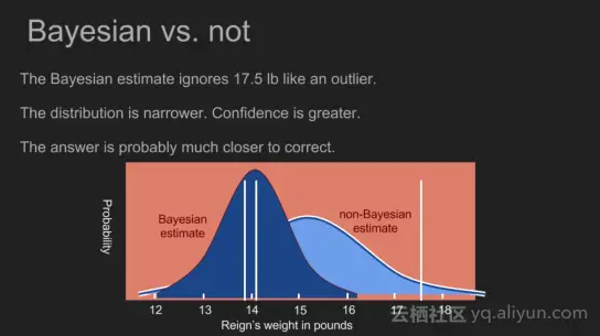 通过整合我们已经知道测量的,我们能够更自信的做出更准确的估计。贝叶斯推理使我们能够很好地利用一个非常小的数据集。我们事先分配17.5磅测量值有一个极低的概率。这几乎与拒绝值一样,但不是基于直觉和常识做的异常检测,贝叶斯定理使我们能够使用数学的方式做这种异常检测。