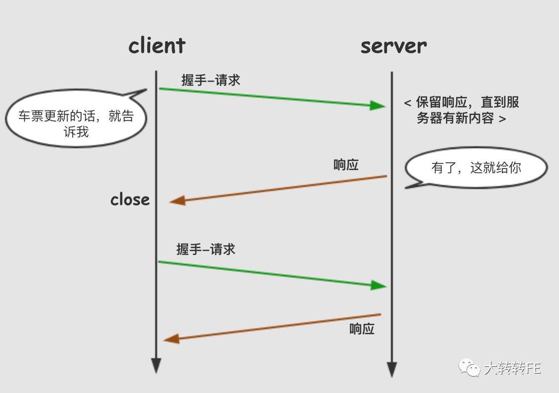 long poll(长轮询): 客户端发送一个request后,服务器拿到这个连接,如果有消息,才返回response给客户端。没有消息,就一直不返回response。之后客户端再次发送request, 重复上次的动作。