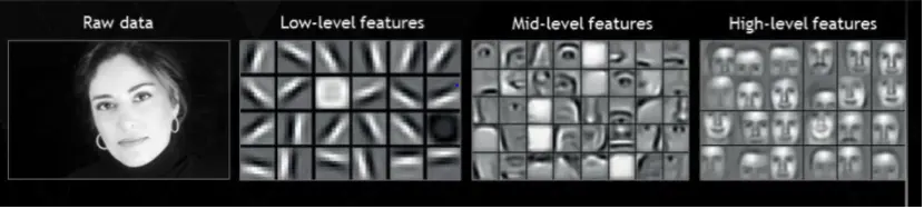 深度学习尝试从数据中直接获取高等级的特征,这是深度学习与传统机器学习算法的主要的不同。基于此,深度学习削减了对每一个问题设计特征提取器的工作。例如,卷积神经网络尝试在前边的层学习低等级的特征(边界,线条),然后学习部分人脸,然后是高级的人脸的描述。更多信息可以阅读神经网络机器在深度学习里面的有趣应用。