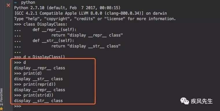 return "display __str__ class"# 使用命令行的形式打印输出 2.x & 3.x 输出效果一致,以2.x作为截图>>> d = DisplayClass()>>> d # 调用repr>>> print(d) # 调用str>>> print(repr(d)) # 调用repr>>> print(str(d)) # 调用str