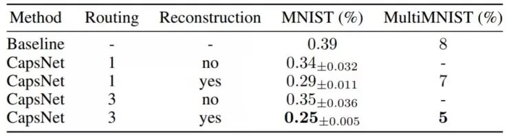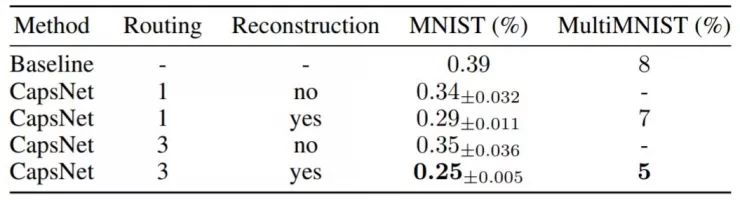 首先在MNIST数据集上,经过三次路由迭代学习、层数也不算多的CapsNet就得到了优秀的错误率。