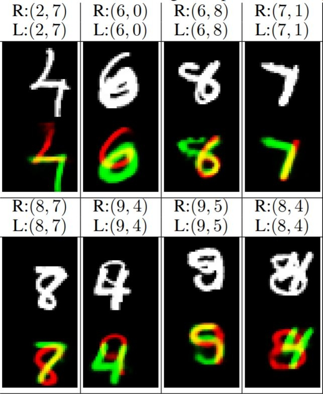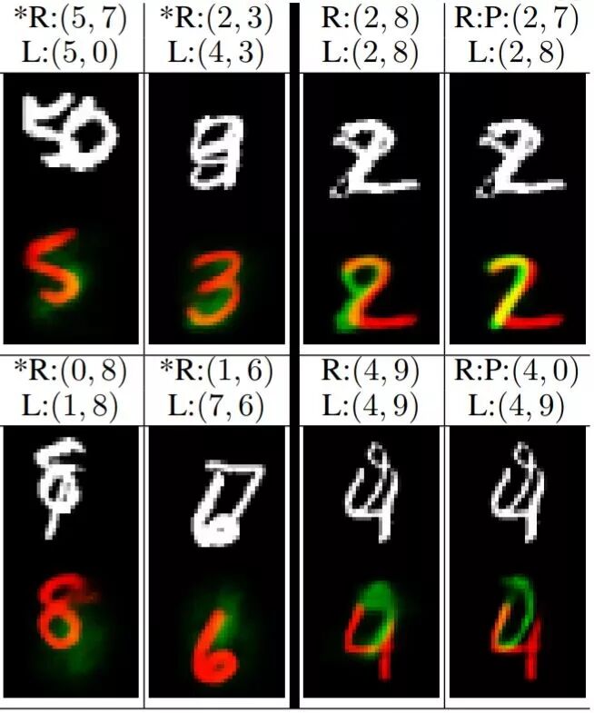 如图,作者们把两个激活程度最高的胶囊对应的数字作为识别结果,据此对识别到的图像元素进行了重构。对于下图中识别正确的样本(L指真实标签,R指激活程度最高的两个胶囊对应的标签),可以看到由于不同的胶囊各自工作,在一个识别结果中用到的特征并不会影响到另一个识别结果,不受重叠的影响(或者说重叠部分的特征可以复用)。