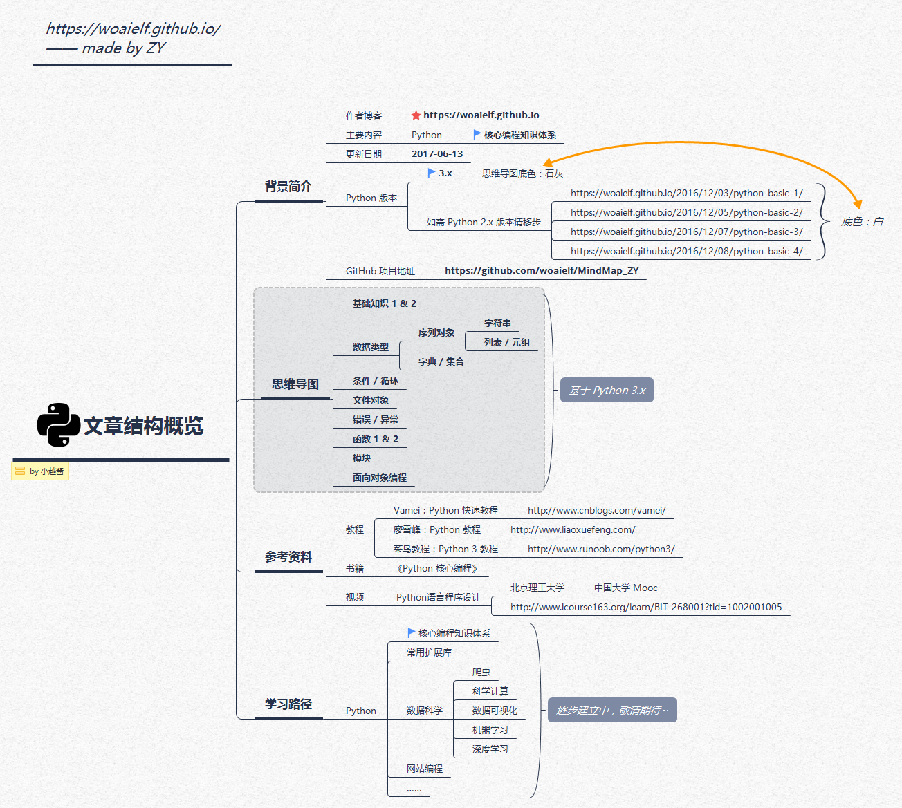 如需基于 Python 2.x 版本的笔记,可移步博客:woaielf.github.io (详见「总览」思维导图)。