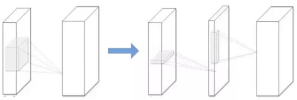 图 2. CNN 模型压缩的低秩近似(Low-rank approximation)。左:原始卷积层。右:使用秩 K 进行低秩约束的卷积层。